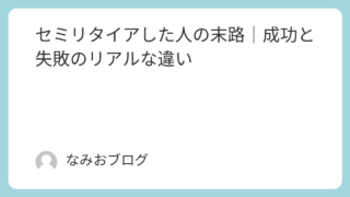 セミリタイアを調べていると、少し気になる言葉を見かけます。「セミリタイアの末路」失敗するの?後悔する?本当に大丈夫?結論から言うと、セミリタイアは「成功する人」と「後悔する人」に分かれます。その違いはお金の量ではありません。今回はセミリタイ...